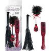 - 10-piece kit includes: Mask, Leash, Collar, 2 Wrist Cuffs, 2 Ankle Cuffs, 2 Cuff Chains, 2 Nipple Clamps, Ball Gag, Whip & Paddle