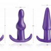 A simple but comprehensive set for the anal curious, this 4 piece kit includes a classically-shaped plug, a smoothly bulbed design, a ribbed style reminiscent of anal beads, and a one-speed bullet vibe that slips easily into all three of them. Each plug is sleek, with just the right amount of give, and tapered for your comfort. Just slide the petite peanut vibrator into the base of the plug you wish to play with, whether you feel like a classic shape, an exciting bulge, or three pops of pleasure.