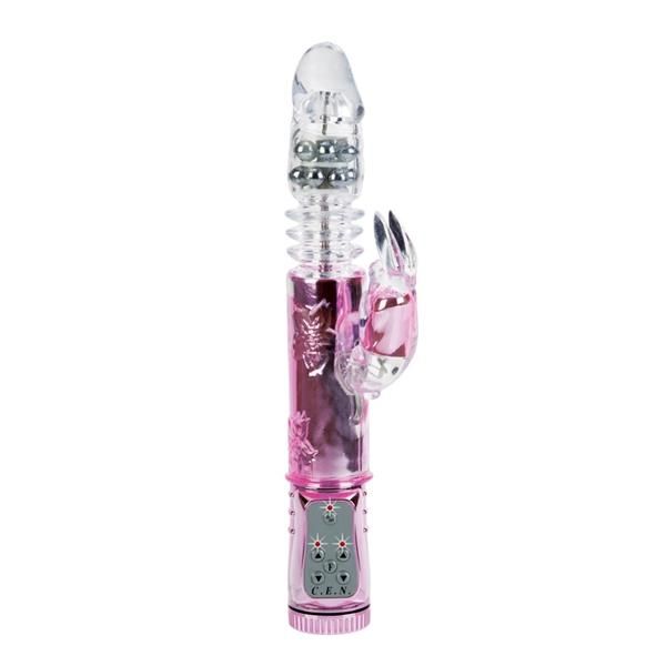 Thrusting Orgasm Thrusting Bunny Vibe is available in two colors: Black and Pink. Each sold separately. Thrusting power for complete arousal. Powerful thrusting action with vibrating and pulsating bunny with dual motors. 8 independent speeds of vibration. 8 independent speeds of thrusting action. 3 incredible functions of vibration, pulsation, and escalation for both motors. Easy push button controls. Auto on/off button. Safe and pure for body and pleasure. Made using phthalate free, non-toxic materials Thermoplastic Rubber TPR shaft, clitoral stimulator, ABS plastic with metallic plating controller, beads. Vibrating sex toy requires 3 AA batteries, not included. Do not leave batteries in the vibrator between uses. A water based lubricant is recommended. Always clean before and after use. Shaft measures 5.25 inches long by 1.5 inches wide. Bulk weight 10.7 ounces. Bunny clitoral stimulator measures 2.5 inches long by 1 inch wide. Category: New Items, For Women, Vibrators, Vibrators. Thrusting Orgasm Thrusting Bunny Pink Vibe is a registered trademark for California Exotic Novelties. Sex Toys and Sexual Wellness. Thrusting motion and rotation can be used at the same time.