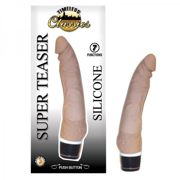 Timeless Classics Collection Super Teaser Vibrator is available in two colors: Flesh and Pink. Each sold separately. Realistic vibrator features 7 functions. Push button base. Waterproof vibrations. Phthalates free, RoHS compliant materials: Silicone shaft, ABS plastic base. Vibrating sex toy requires 2 AA batteries, not included. Do not leave batteries in the vibrator between uses. A water based lubricant is recommended. Length: 7 inches. Always clean before and after use. Timeless Classics Super Teaser Flesh Vibrator by Nasstoys of New York. The best in adult toys.