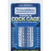 Titanmen Tools Clear cage stretch to fit cock ring. Dimensions 2.00 inches length, 1.50 inches width, 1.50 inches depth. Fulfilling the same basic function as a cock ring, but broader and more robust, Titanmen’s reliable Cock Cage lets you stay harder longer while adding girth. The sleeve is stretchy, has ribbed texture for enhanced stimulation for your partner, and provides a cozy tightness for your cock. Made of Thermoplastic Elastomers TPE, this Cock Cage is phthalate free and body safe. Doc Johnson’s advise you not to wear it for more than about 20 minutes at a time. Made in the USA