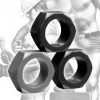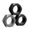 This set of stretch to fit cock rings work great as cock rings or as ball stretchers. The firm material holds strong yet has lots of give. Perfect for erection enhancement and pleasure. Wear separately or together for customized results. Measurements: 1 inch inner diameter, unstretched. Material Thermoplastic Elastomers TPE. Colors Black, Silver. Note free collector print included!