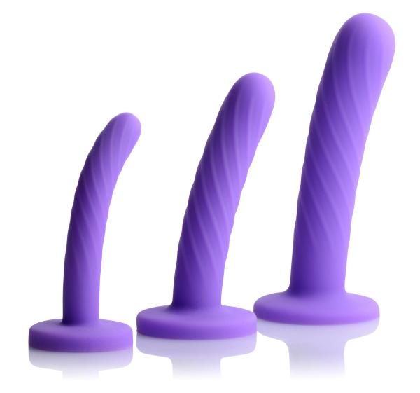 This set of 3 silky, smooth dildos is perfect for getting you accustomed to vaginal or anal penetration. Your tight hole needs to be coaxed and pleasured before it allows entry of a big dick or dildo, so start small with the finger sized shaft. Subtle swirled ridges protrude for a delicious texture as you insert. Protruding more in the longer and girthier medium sized shaft, they will massage the walls of your orifice as it slides in. Finally, your body will be ready for the largest of the three dildos. Savor the sensation as it pushes into you! The slight curve on each one will ensure that the right place is stimulated: the P-spot in male ass and the G-spot when used vaginally on a woman. The suction cup bases make them perfect for solo use, sticking firmly to most smooth, hard surfaces.
