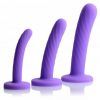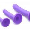 Made of quality silicone material, these purple shafts are firm, yet flexible. The material is non-porous, cleaning easily and effectively with soap and water. Avoid use with silicone lube. Measurements small dildo 5 inches in total length, 4.5 inches insertable, .8 inch in diameter. Medium dildo 5.75 inches in total length, 5.25 inches insertable, 1.15 inches in diameter. Large dildio 7 inches in length, 6.5 inches insertable, 1.5 inches in diameter. Material Silicone. Color Purple. Please note Strap on harness, not included. Sold separately.