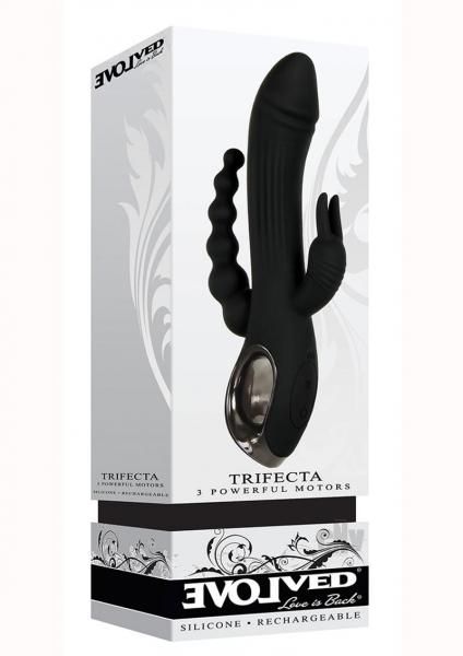 Discover the most intense and deeply fulfilling orgasm possible – the trigasm! Stimulate three erogenous zones at once to experience other-wordly pleasure that will leave your knees weak. The realistic phallic-shaped main shaft deliver powerful internal vibrations while the clitoral stimulator buzzes your climax zone with hard-working bunny ears. Meanwhile, the beaded anal shaft gently and gradually slips inside your back door to complete the tantalizing trifecta of pleasure! Find the right rhythm for your unique taste, enjoying three motors in all, and explore your trigasm in the bath or shower as it`s completely submersible in water. Clean with Evolved Toy Cleaner and a hot water rinse.