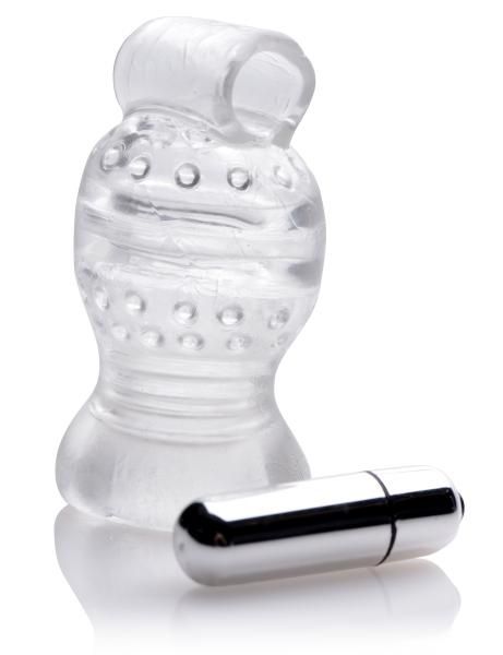 Stretch this enticing jack off sleeve onto the head of your penis to experience buzzing bliss! Textured internally with nubs and ridges, this teaser will treat you to a unique massage while you masturbate or even play with your partner. The vibrating bullet will cause the whole sleeve to thrum, and it can even be removed for use on other parts of the body! Use this pleasure tool with silicone based or water based lube and clean with mild soap and warm water.