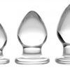 Compatible with all lubricant types. Includes three complementary velvet storage satchels. Measurements: Small plug is 2.25 inches in overall length, 1.75 inches insertable, 1.25 inches at widest diameter. Medium plug is 2.75 inches in overall length, 2.25 inches insertable, 1.75 inches at widest diameter. Large plug is 3 inches in overall length, 2.5 inches insertable, 1.8 inches at widest diameter. Material Borosilicate glass. Color Clear.