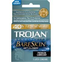 Trojan BareSkin. Our thinnest latex condom ever. 40% Thinner than our Standard Condoms. Silky Smooth Lubricant for comfort and sensitivity. Premium low-odor latex to help ensure reliability and reduce the risk. Each Condom is electronically tested and meets U.S. standards for strength to help ensure reliability.