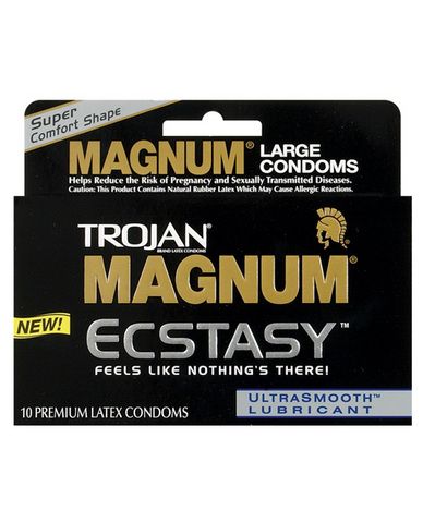 TROJAN® MAGNUM® ECSTASY™ condoms feature a revolutionary new design that let’s you feel the pleasure, not the condom! * Comfort shape allows freedom of movement for a more natural experience * Larger than standard latex condoms for extra comfort * Textured for stimulation * Tapered at the base for a secure fit * UltraSmooth™ Premium Lubricant inside and out for a more natural feel * Made from Premium Quality Latex – to help reduce the risk * Each Condom is Electronically Tested – to help ensure reliability