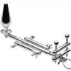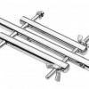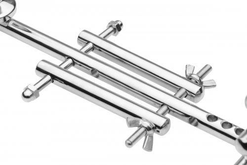 This exquisitely crafted piece is the ultimate constriction device. Constructed entirely from high grade stainless steel, each bar and rod is designed to envelop and restrict your male sub, keeping them deliciously confined. The top piece is designed to put pressure at the base of the cock, with two adjustable screws to either side. The middle piece is designed to separate and confine the testicles, one to each side of the bar. Two wing nuts allow you to trap them between the rods, for an inescapable prison of steel. The anal plug is fixed onto the end of the supporting bar, and is removable.