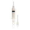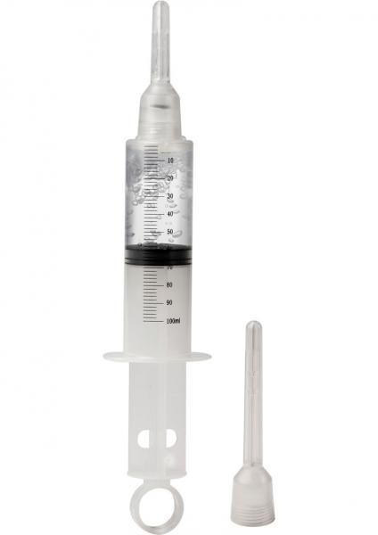 Hygienic cleansing system with incremental measures, easy pull ring plunger, and 2 interchangeable attachments. Reusable, easy to use, disassembles for cleaning. Polypropylene PP tube and attachments, Silicone seal and ring. 4.75 inches by .5 inches long attachment. 3.25 inches by .5 inch short attachment.