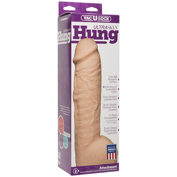 Satisfy your craving for size with Ultraskyn Hung from Vac-U-Lock! Featuring over 12 inches of massive length and 3 inches of incredible girth, Hung offers a dual density life like feel with every detail realistically captured from the plump head, to the bulging veins. Compatible with any Vac-U-Lock Set, Accessory, as well as O-rings, this Attachment includes a Large O-ring specifically designed to fit the hefty girth of Hung. Get ready to experience endless possibilities in pleasurable play with this massive cock! Total length 12.5 inches, insertable, usable length 9.70 inches, width, diameter 2.70 inches.
