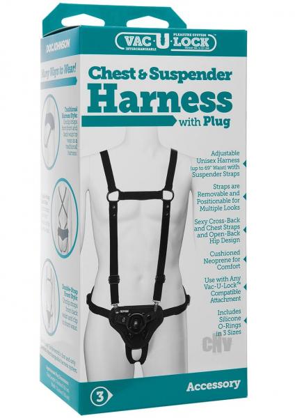Features adjustable unisex harness with removable suspender and chest straps. Sexy cross back straps and open back hip design. Padded front and belt for comfortable use with any Vac-U-Lock compatible attachment Includes Silicone o-ring for multiple uses.