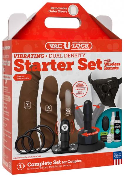 Your perfect strap-on experience is on lock with Doc Johnsons deluxe line of full-service Vac-U-Lock Deluxe Sets. The Vac-U-Lock Dual Density ULTRASKYN Set is a solid investment for upgrading or beginning your strap-on accessories collection, offering multiple options in one box via a complete harness with removable O-rings, a 7-function rechargeable vibrating Vac-U Plug with remote, three ULTRASKYN attachments, and a bottle of Mood water-based lube. These lifelike dual density attachments a 7″Thin Dong, a 6″Spiral Dong, and a 5.5″Textured Cock warm to body temperature with use and feature a soft exterior that gives way to a firm inner core, recreating the feel of a real erect penis. Attachments can be used with the harness, the included 360 Swivel Suction Cup, and any other accessory or harness in the line. The Vac-U-Lock Dual Density Starter Set also includes Doc Johnson Natural Toy Cleaner and ULTRASKYN Refresh Powder to properly and hygienically maintain your dual density ULTRASKYN attachments. Every product in the patented Vac-U-Lock system is designed to help you create any strap-on or toy youre in the mood for, and its as simple as popping on the attachment of your choice.Total Length:7″Thin Dong: 7.5 in. (19.1 cm) – 6″Spiral Dong: 6 in. (15.2 cm) – 5.5″Textured Cock: 5.5 in. (14 cm)Insertable/Usable Length:7″Thin Dong: 7.5 in. (19.1 cm) – 6″Spiral Dong: 6 in. (15.2 cm) – 5.5″Textured Cock: 4.5 in. (11.4 cm)Width/Diameter:7″Thin Dong: 1.5 in. (3.8 cm) – 6″Spiral Dong: 1.5 in. (3.8 cm) – 5.5″Textured Cock: 1.5 in. (3.8 cm)Circumference:7″Thin Dong: 5 in. (12.7 cm) – 6″Spiral Dong: 4.75 in. (12.1 cm) – 5.5″Textured Cock: 5 in. (12.7 cm)