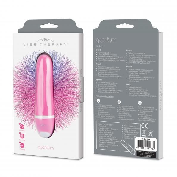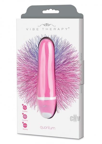 Why choose quality over quantity when you can have both? With the Vibe Therapy Quantum, every use is a new invitation for pleasure and arousal that will keep you coming back for more. It is a petite bullet of a vibrator with seven exciting levels of intensity varying in pulse length and strength. It is made from medical grade, hypoallergenic silicone coated in a ravishing pink. Easily able to fit in the palm of your hand with a simple power button conveniently placed at its base, this whisper quiet vibrator is adorably packaged and battery powered. Quantum is a modest device that delivers nonstop fun and sensational clitoral stimulation. It is three and a half inches in size, but size does not matter here: the Quantum provides outstanding performance despite its slight stature. Alleviate all stress or frustration in a touch of a button with the Vibe Therapy Quantum.
