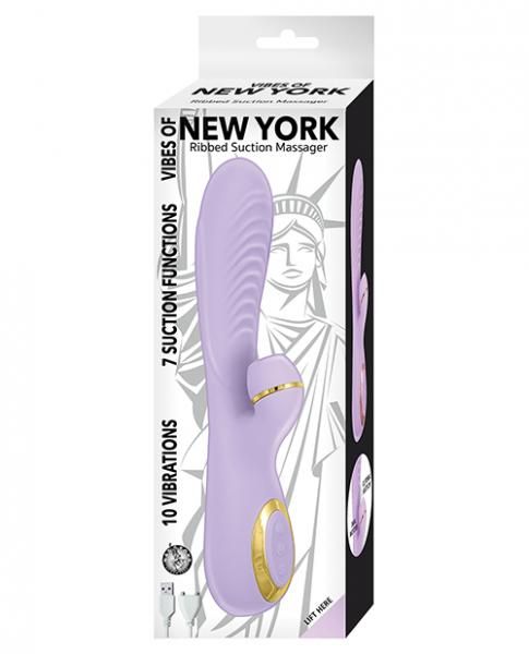 Vibes of New York Ribbed Suction Massager Lavender Vibrator from Nasstoys. Features: specially designed to reach all your erogenous zones. 10 vibrations. 7 clitoral suction functions. Dual motors. Clitoral suction for extra stimulation. Made using body safe, latex free, Phthalates free RoHS compliant materials Shaft, clitoral suction Silicone, Base ABS plastic. Size length 9.25 inches, insertion length 5 inches. Rechargeable vibrations via a USB cord. Charging time 2 to 3 hours. Working play time 60 minutes.