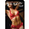 Vixen No Strings Attached Bra and Side Tie Panty from Fantasy lingerie. Halter tie cutout lace bra with tie back and matching side tie panty. Features tie back and side ties for versatile fit. Cutout cups and panty. Stretch lace. Scallop trim. Color Red.