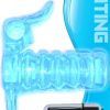 Wet Dreams Plump Bunny Blue Rabbit Sleeve from Hott Products Unlimited. Features a vibrating bullet for added stimulation. The Plumb Bunny works like a cock ring to prolong male climax while intensifying female orgasm with the bunny ears to stimulate the clitoris. The main portion is ribbed for more excitement.