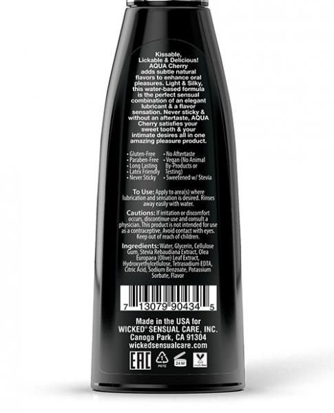 Keep calm and cherry on! Kissable, lickable, and delicious, Wicked Aqua Cherry personal lubricant adds subtle and delicious natural flavors to enhance oral pleasures. Light and silky, this water-based formula is the perfect sensual combination of an elegant lubricant and a flavor sensation. Never sticky and without an aftertaste, Wicked Aqua Cherry satisfies your sweet tooth and your intimate desires all in one amazing pleasure product. Oral sex never tasted so good. Whether you are giving or receiving, our flavors will give you a new sexy confidence.