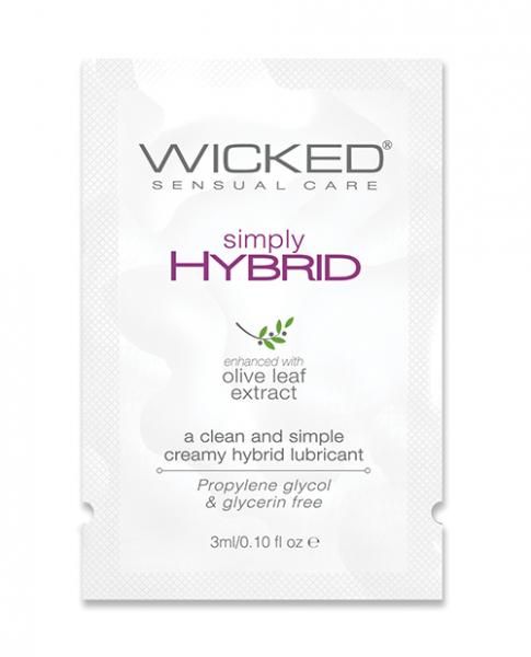 Do it simply. Simply lubricants are made without Glycerin, Propylene Glycol or Parabens and are Vegan and Cruelty Free. Like all Wicked Sensual Care formulas, they are enhanced with our signature Olive Leaf Extract, a natural biostatic, that inhibits the spread of harmful bacteria and microorganisms. When you are ready for a clean lube, do it simply. A clean and simple water + silicone blend. Compatible with silicone toys. .1 ounce foil pac of the Simply Hybrid formula.