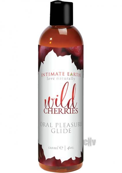 Intimate Earth Oral Pleasure Glide Wild Cherries 4 fluid ounces. Smells light, sweet and fruity, with a decadent richness thats hard to match. The flavor is very sweet, exceptionally yummy and highly addictive, tasting like a mouth watering cherry candy you just can not get enough of. Ingredients: Water/Aqua, Glycerin, Hydroxyethylcellulose, Flavor, Citric Acid, Potassium Sorbate, Sodium Benzoate, Stevia, Rebaudiana Leaf Extract, Aloe Barbadensis Leaf Extract, Cymbopogon Schoenanthus Extract, Lycium Barbarum, Goji Fruit Extract. Organic ingredients. Made in the USA