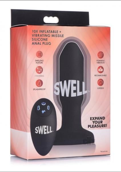 Shove a missile up your butt and wait for the explosion! Expand your pleasure with this inflatable and vibrating anal toy unlike any other. This silky-smooth silicone plug will gently swell within you for an unbelievable sensation of fullness. Treat yourself or your partner to 7 modes of vibration, including 3 speeds and 4 patterns. The remote control does it all, sending buzzes into you booty, as well as allowing you to find the perfect inflation point. Just hold down the button on the left to begin the ballooning, or press it more carefully for a slow, gradual growth. The button on the right will instantly deflate it back to its original size for a comfortable removal. Made of premium silicone, this Swell Plug is non-porous and phthalate-free for body-safety. Clean this splashproof pleasure tool with warm water and either toy cleaner or mild soap after use. Avoid use with silicone lubricants to preserve this material. Measurements: 5.5 inches in total length, 4.6 inches insertable length, 1.1 inches in diameter at stem, 1.5 inches at widest diameter deflated, 2.2 inches at widest diameter inflated Material: Silicone Color: Black Note: Charges via USB. Remote requires 2 AAA batteries, not included.