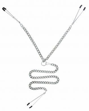 Adjustable rubber tipped tweezer style nipple clamps with detachable jewelry chain and clit clamp.