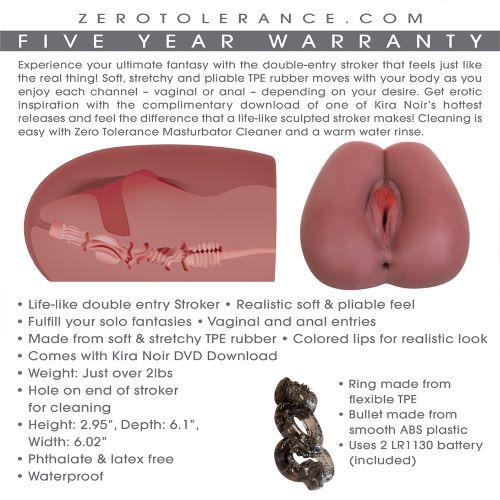 Zero Tolerance Kira Noir Movie Download and Dual Stroker from Evolved Novelties. Fulfill your double fantasy with this two-channel stroker that lets you slip through the front door and bang the back door as hard as you want! Crafted with super-stretchy and pliable Thermoplastic Elastomers TPE that moves with your body as you thrust, use the hips to hold on, and dive into that pink sweet spot primed with complimentary Zero T lube. Feel the life like tight fits of vaginal and booty canals all around you as you watch the notorious Kira Noir for some superhot hardcore inspiration! Life like double entry stroker. Made from stretchy, pliable TPE rubber. Realistic vagina and anal channels. Pink-colored vaginal lips. Hip handles at sides for easy grip. Perfect for front and back door fantasies! Superhot Kira Noir DVD Download included. Zero Tolerance Lube foil pack included. Hole at end of stroker for easy cleaning. Phthalate and latex free. Waterproof. Size 2.95 inches in height, 6.1 inches in depth, 6.02 inches in width. Made using body safe, phthalate free materials Thermoplastic Elastomers. 5 years warranty.